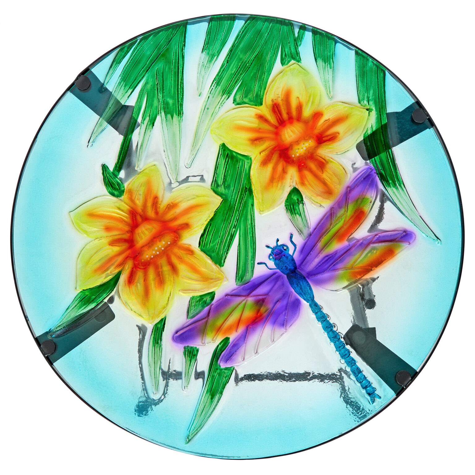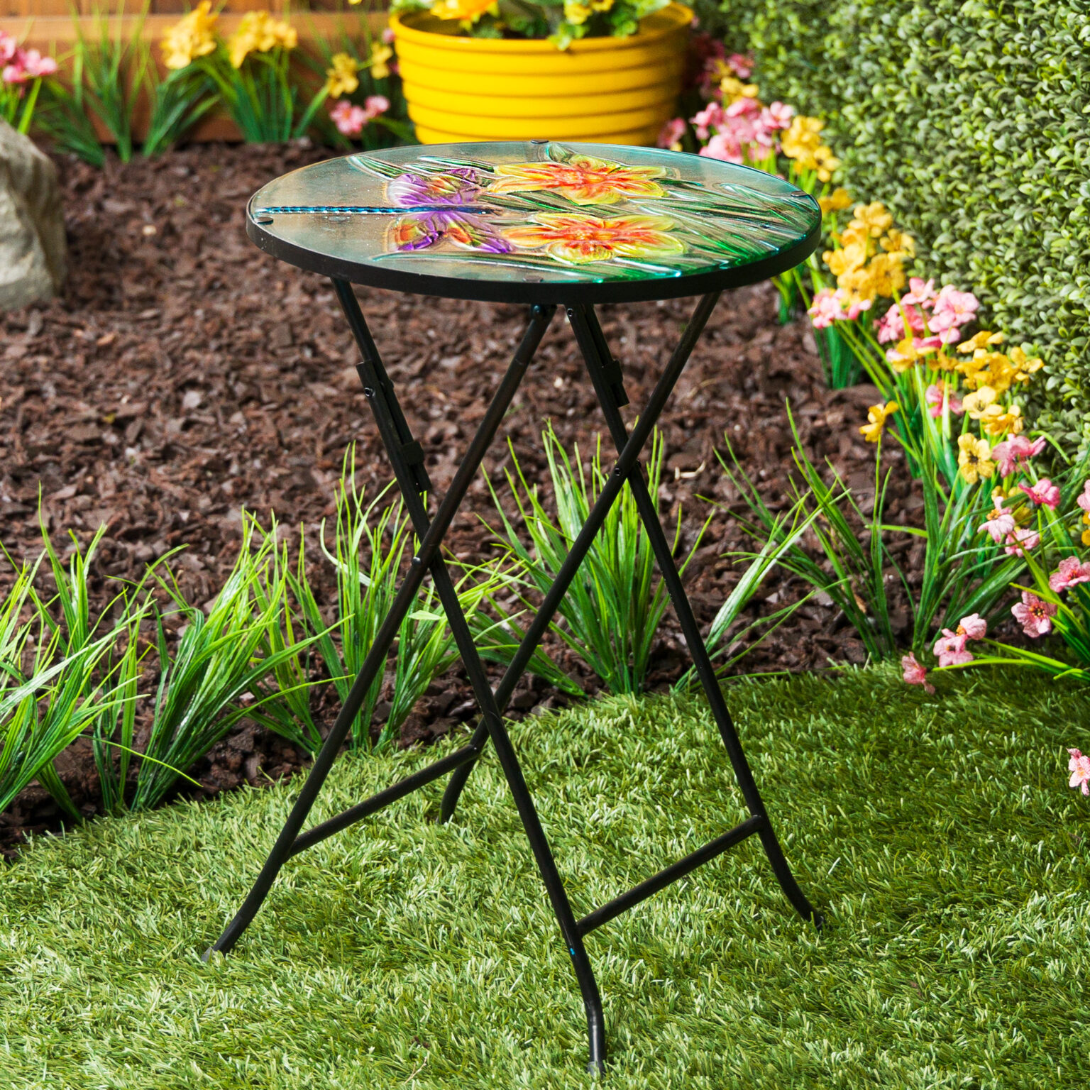 Alpine Corporation KBD163T-14 Folding Glass Round Table with Flowers and Dragonfly, Floral DĂ©cor for Patio & Deck, 14″W