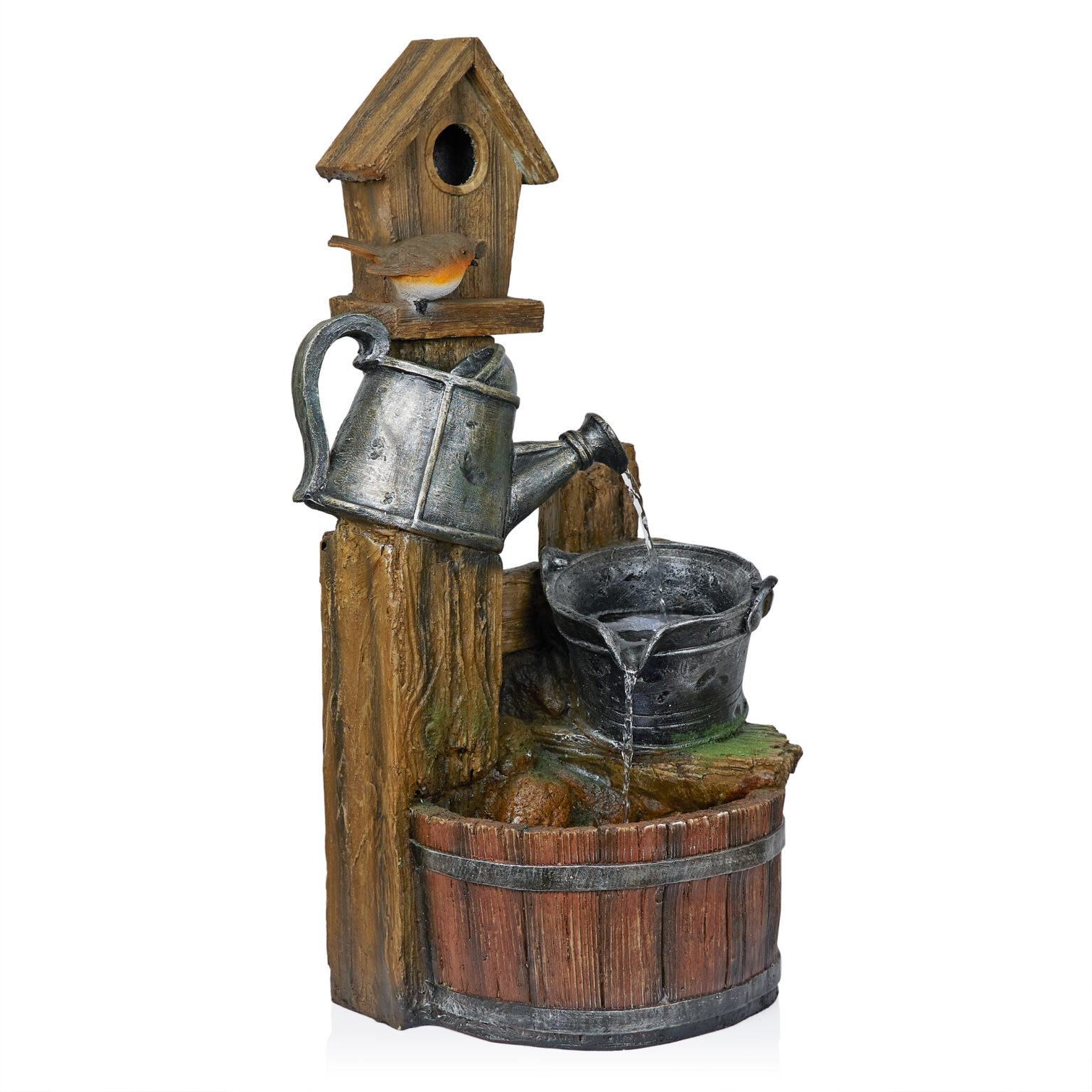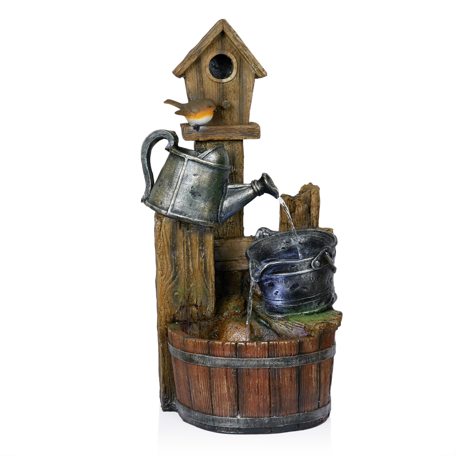 Alpine Corporation TZL280 Watering Can Barrel Birdhouse Fountain w/ White LED Lights, Stylish Décor for Garden & Patio, 32″H